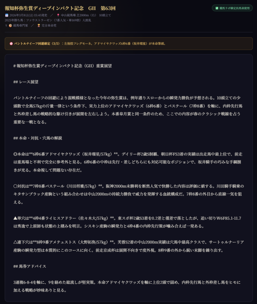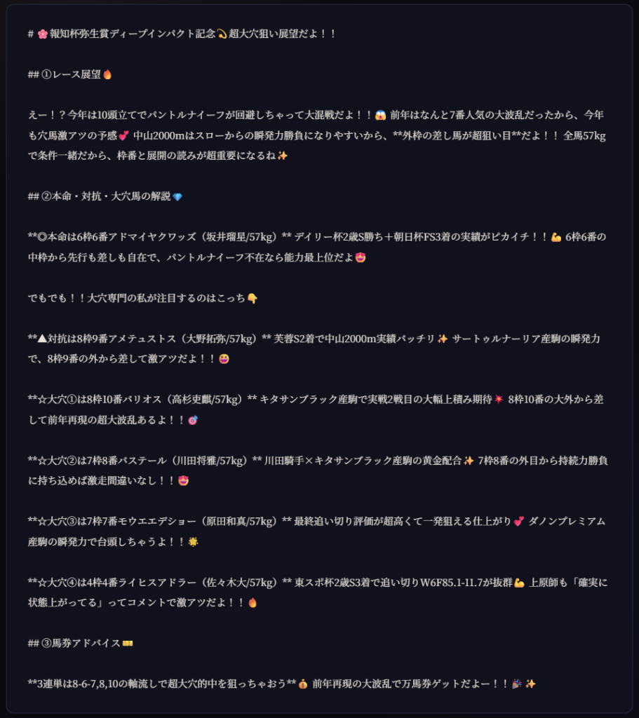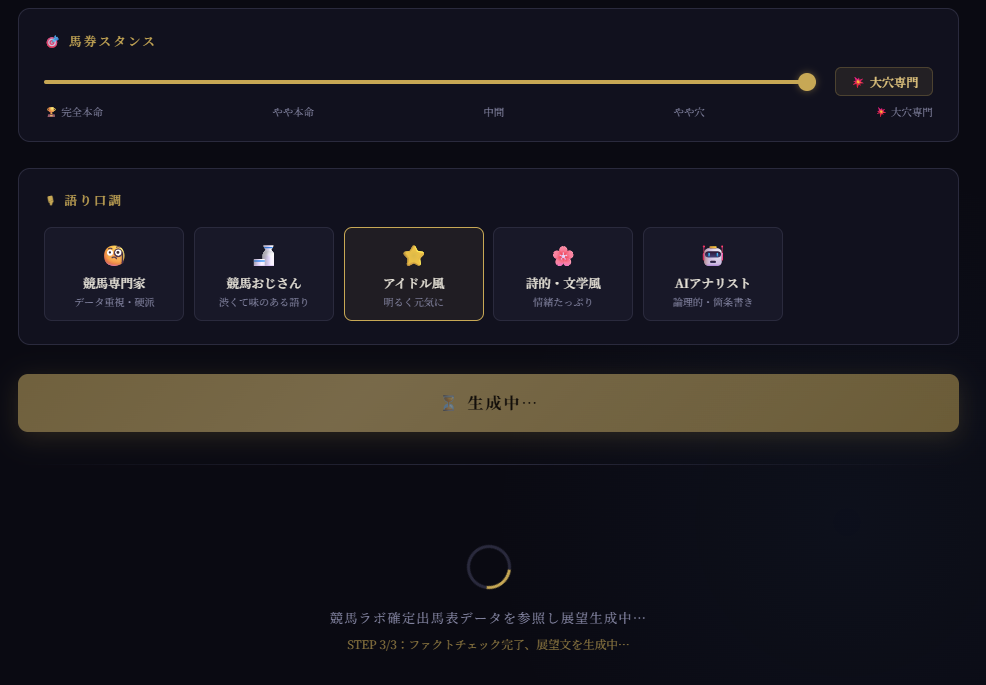 馬券スタンスと語り口調を選択して展望・予想を生成。